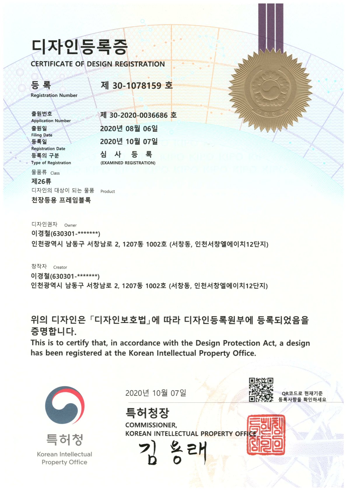 디자인등록증 30-1078159
