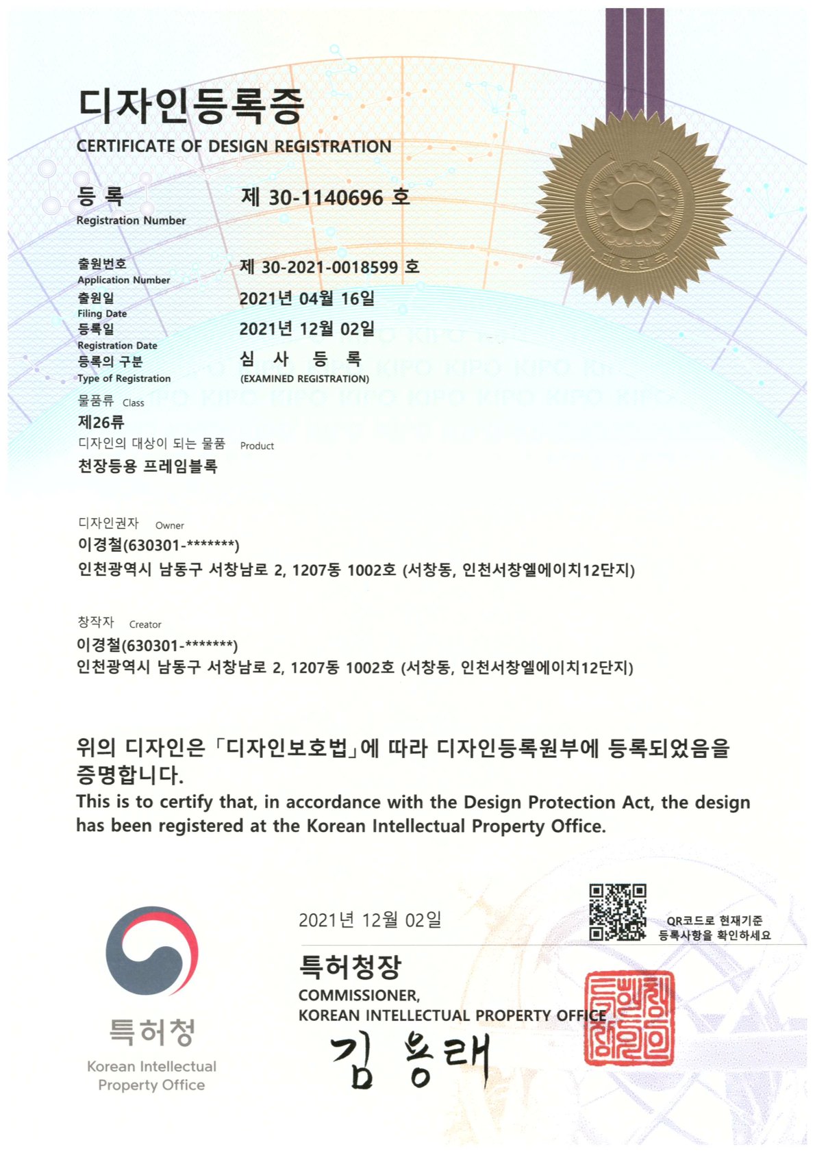 디자인등록증 30-1140696