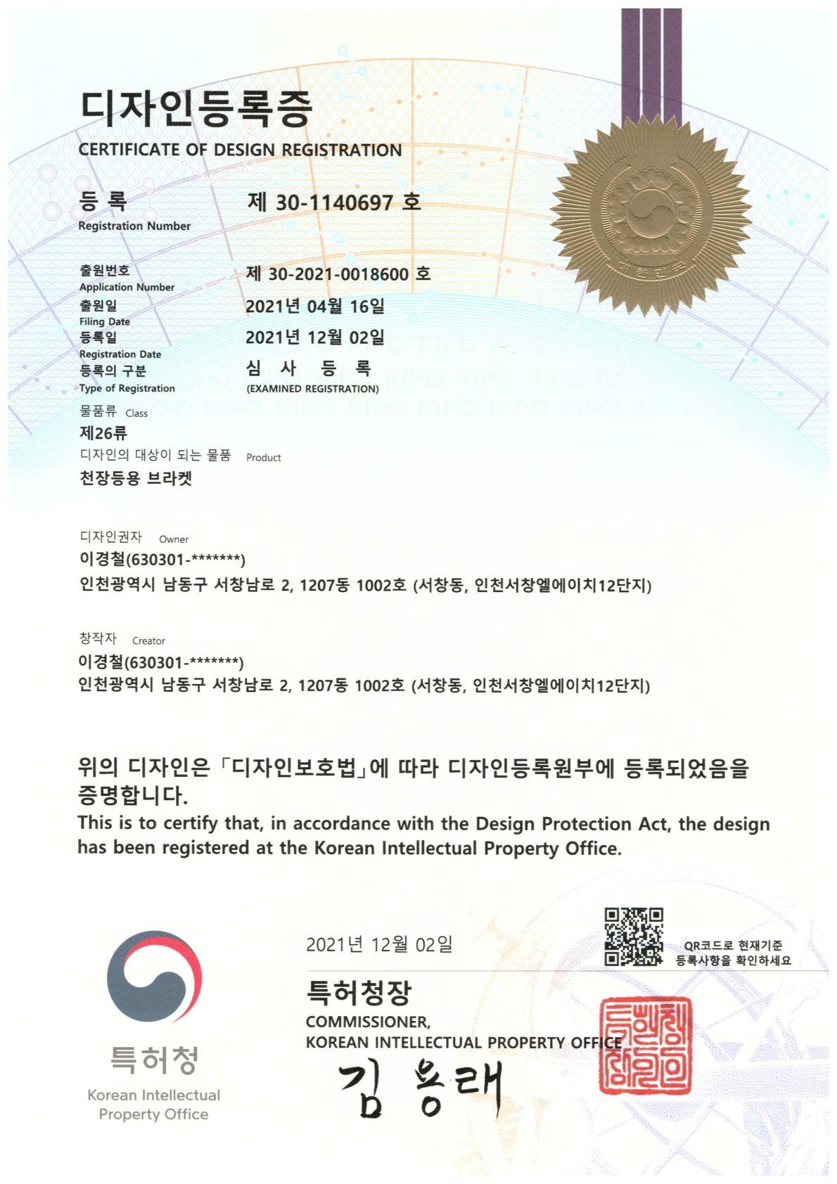디자인등록증 30-1140697