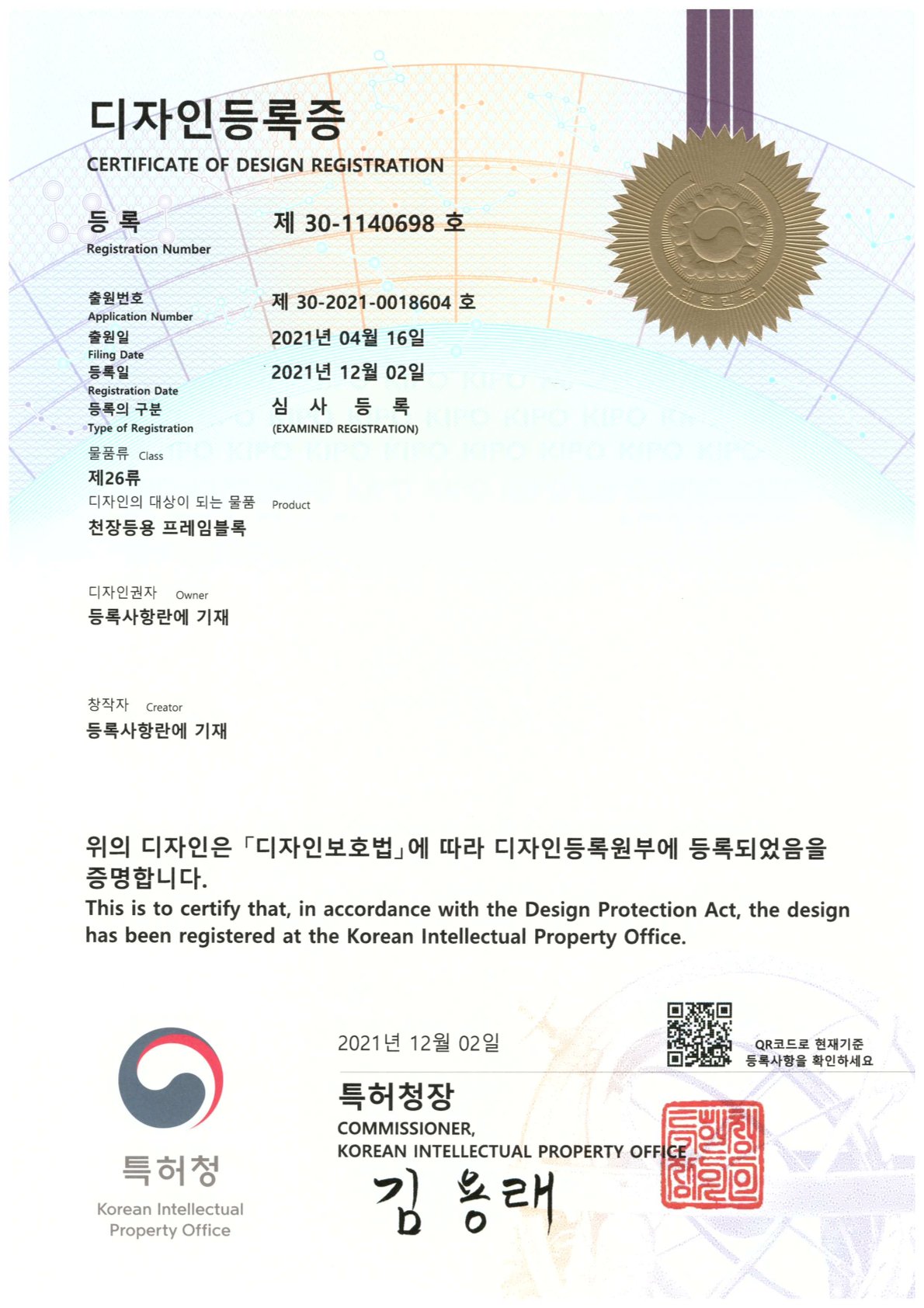 디자인등록증 30-1140698