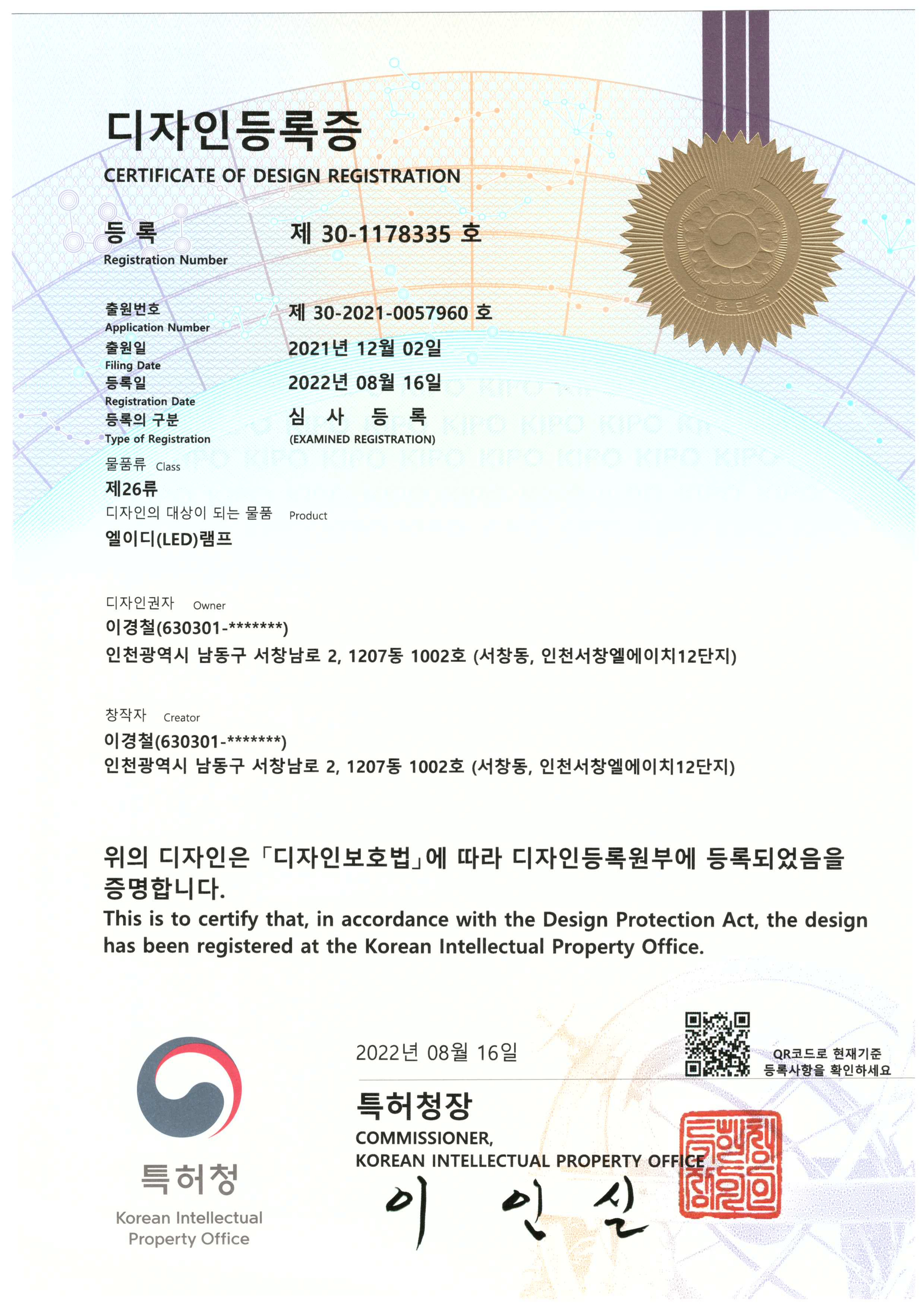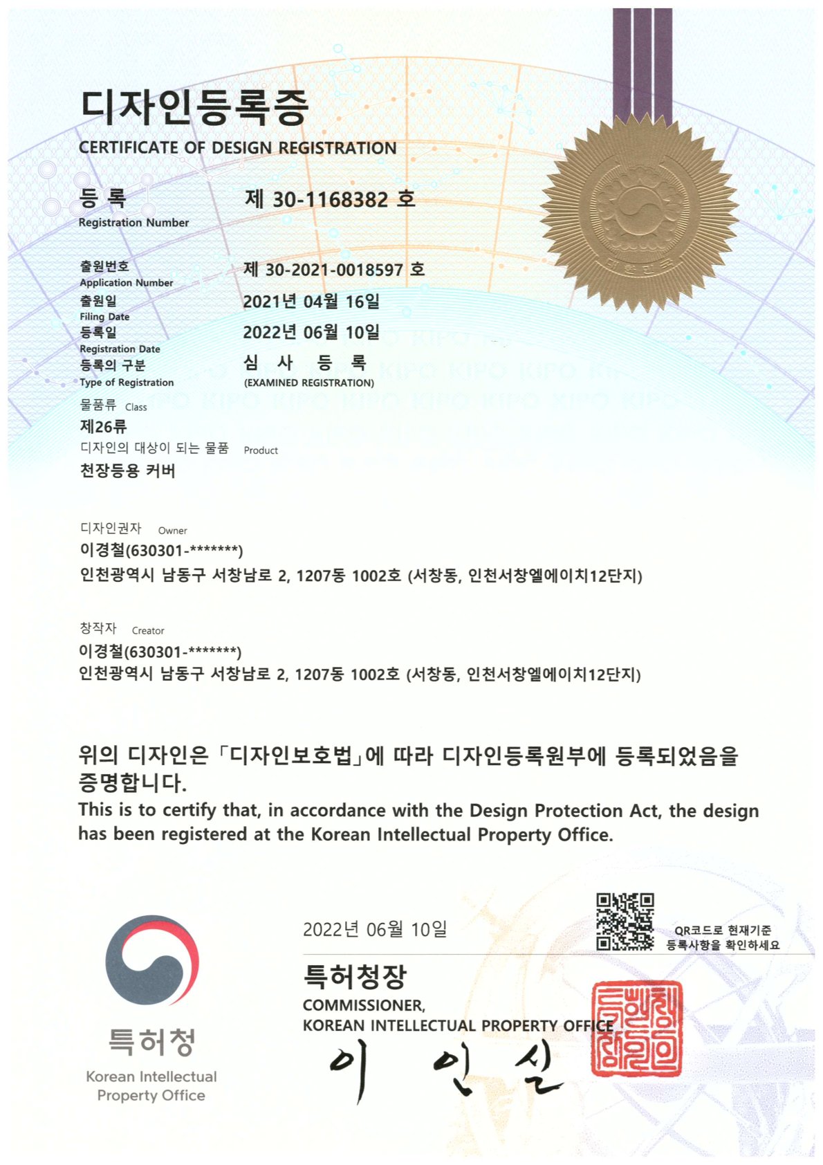 디자인등록증 30-1168382