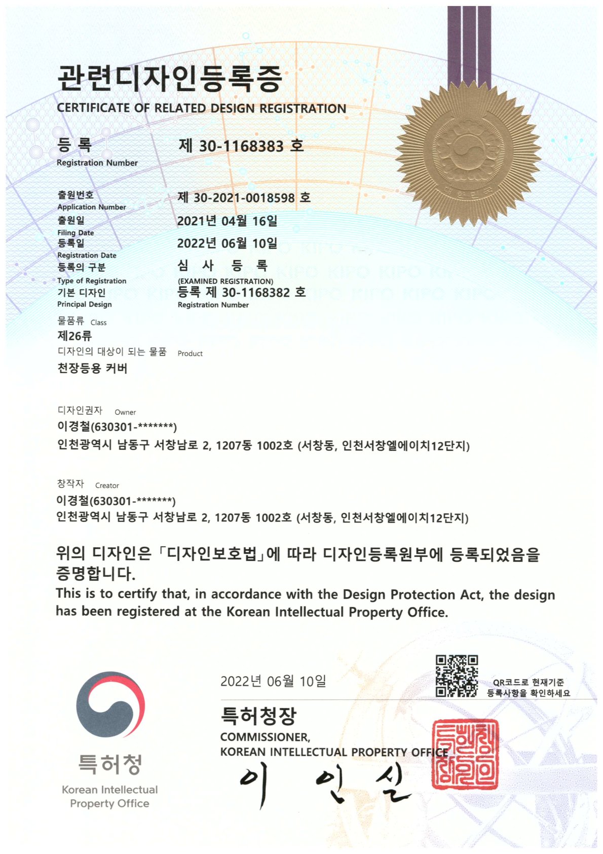 관련디자인등록증 30-1168383