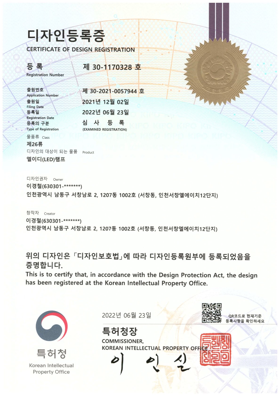 디자인등록증 30-1170328