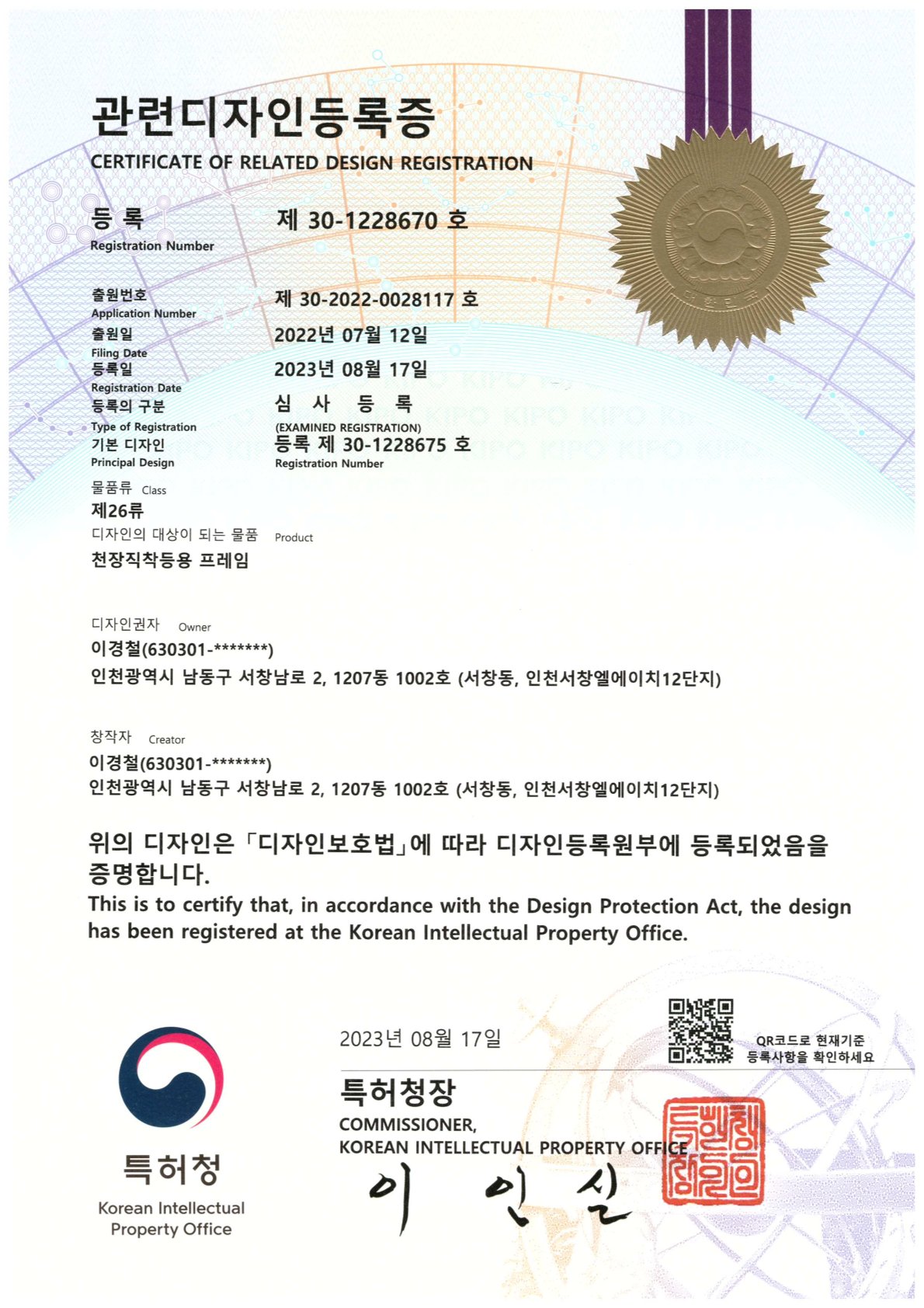 관련디자인등록증 30-1228670